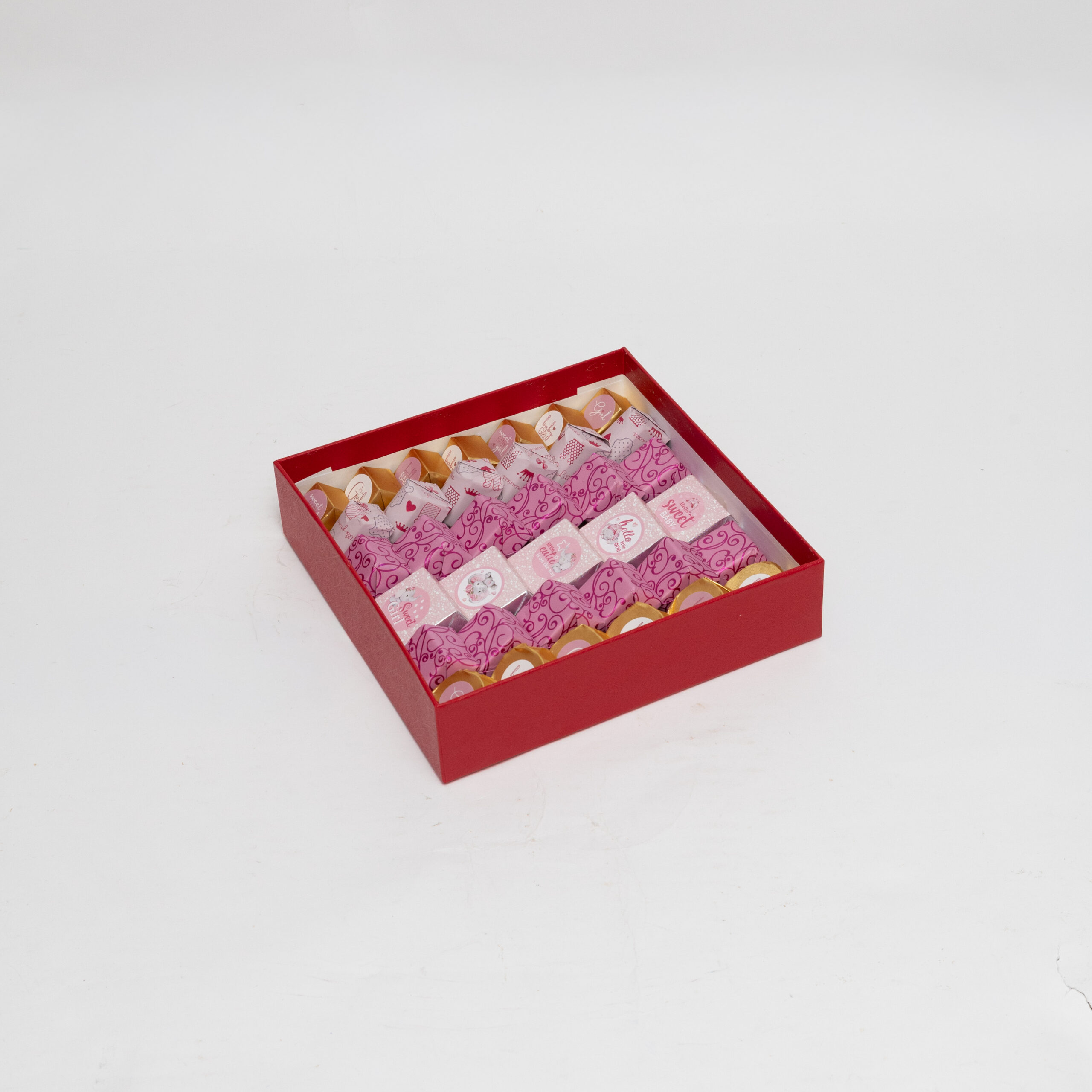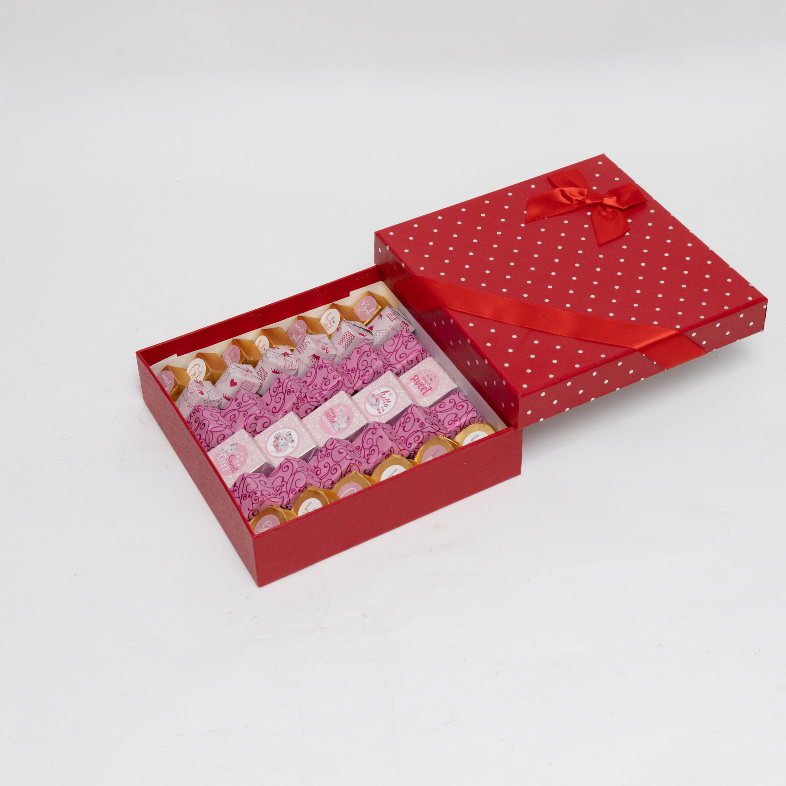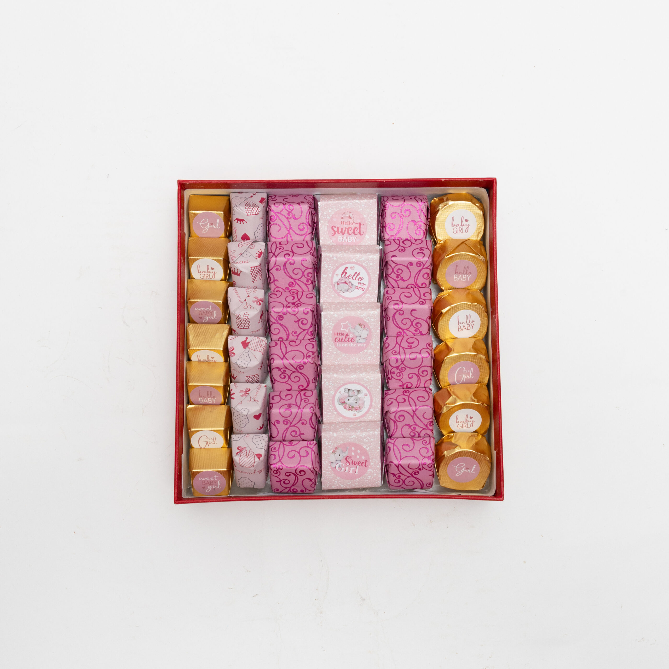A medium baby girl chocolate treasure with 92 pieces — beautifully balanced for a memorable baby celebration.