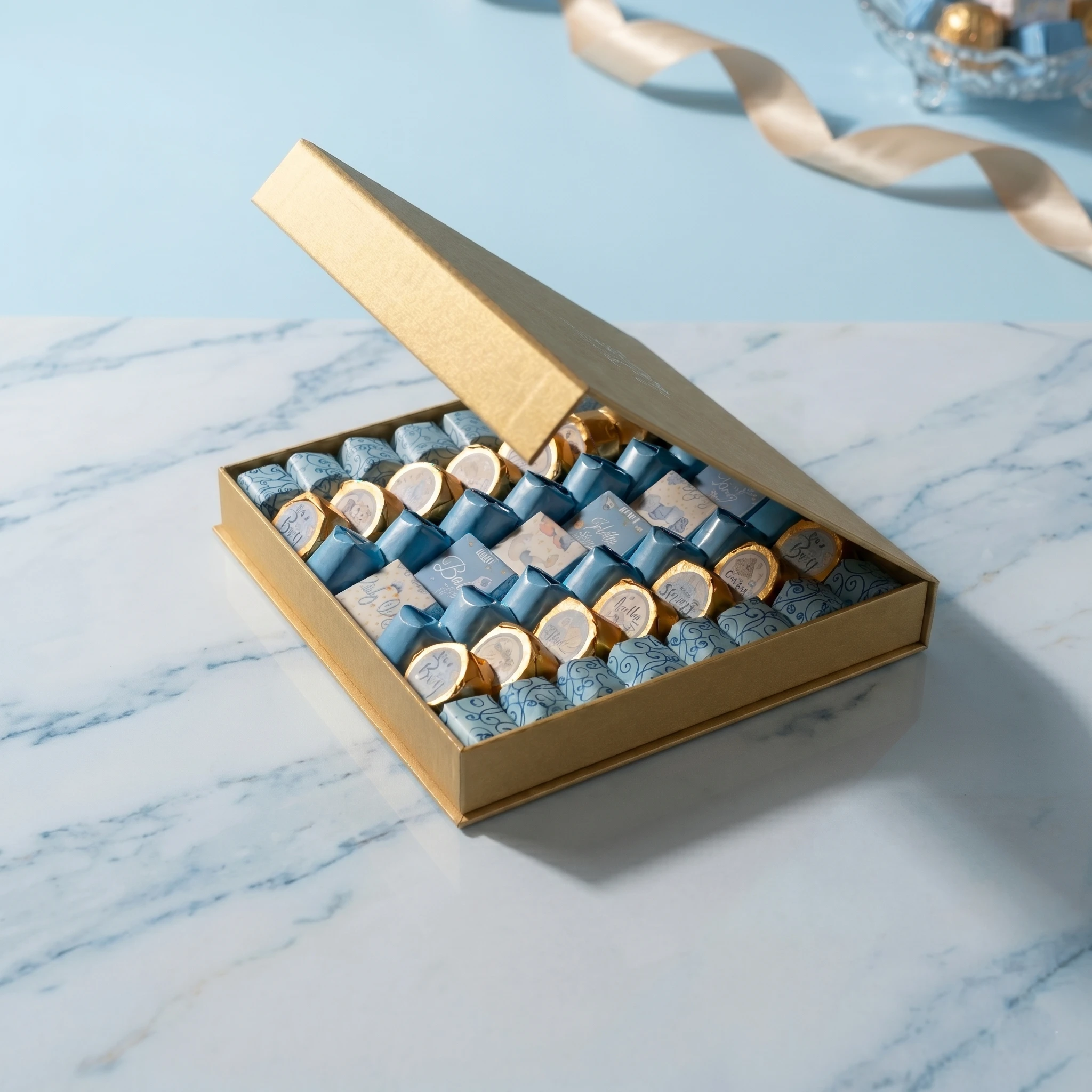 A medium baby boy chocolate cuddle box with 133 pieces — generous and full of love for a baby boy’s arrival.