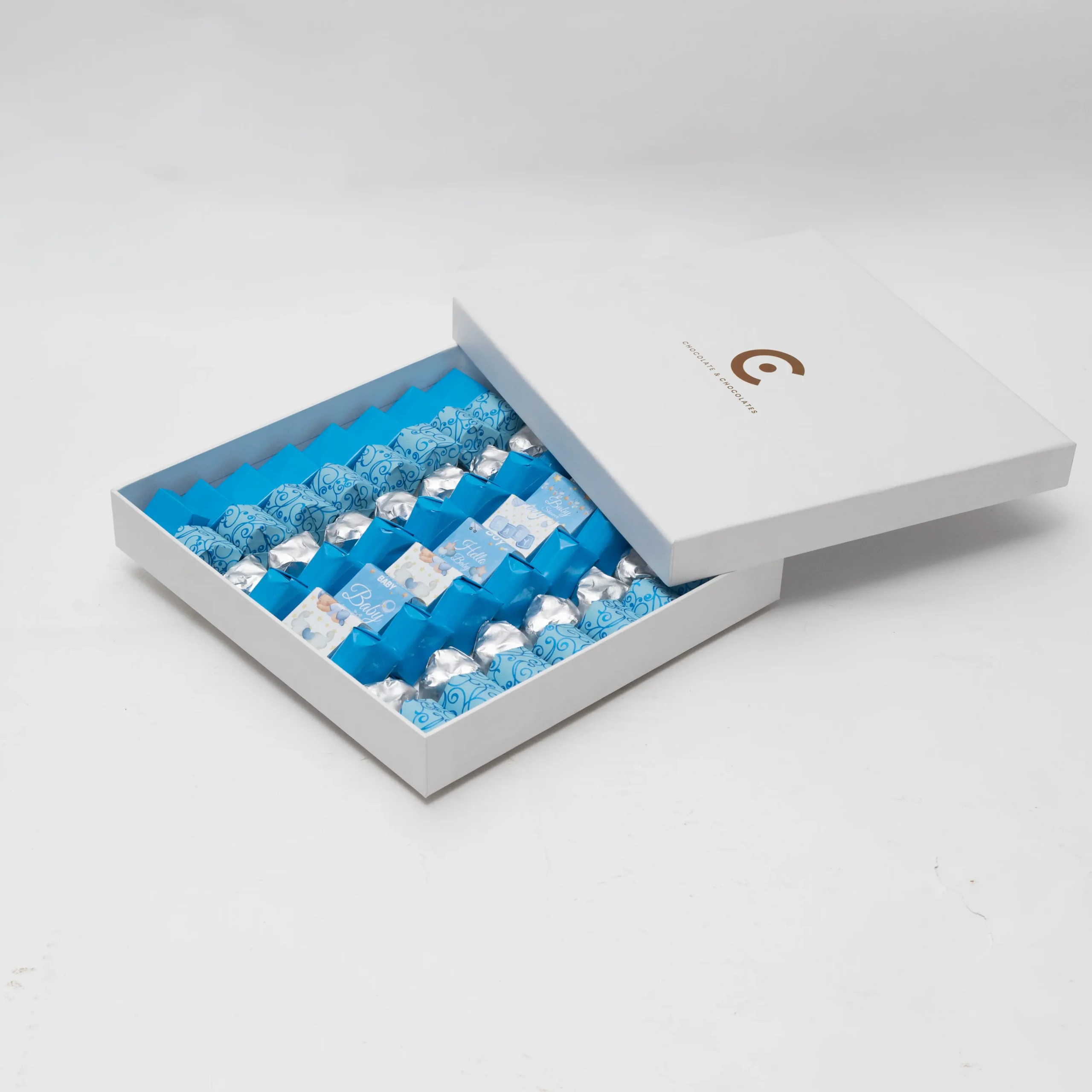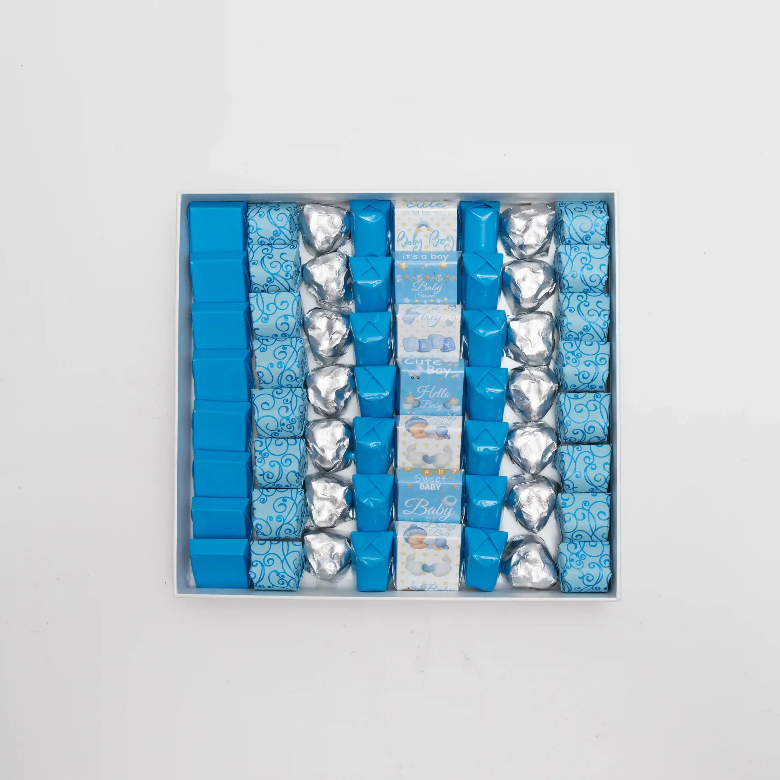 Almond Praline (16 pcs), Dark Cocoa with Almond (3 pcs), Mix Nuts (3 pcs), Lotus with Feuilletine (14 pcs), Nutella Feuilletine (14 pcs), Nutella Wafer (10 pcs), Oreo Cream (14 pcs), Pistachios Nougat (7 pcs), Dark Ganache (8 pcs), Pistachios Cream (8 pcs)