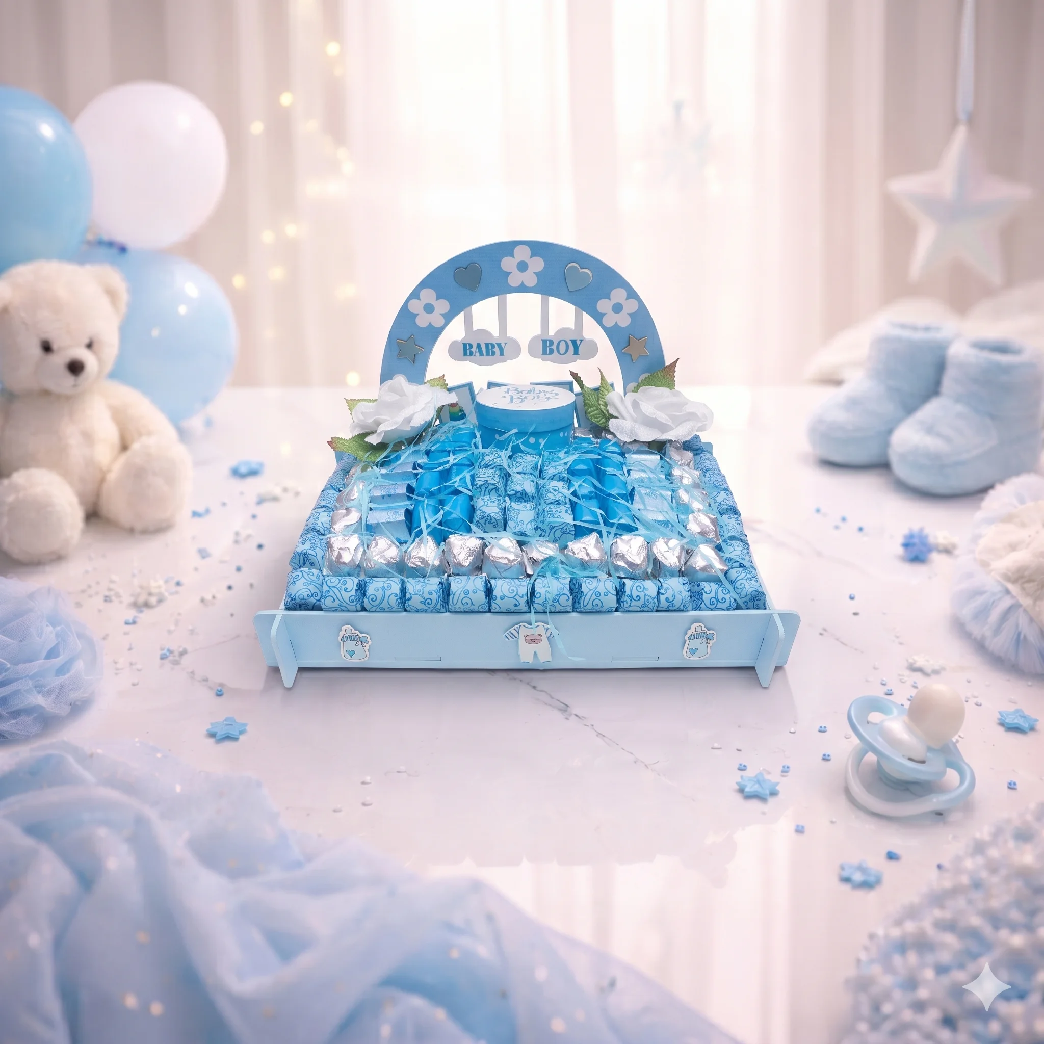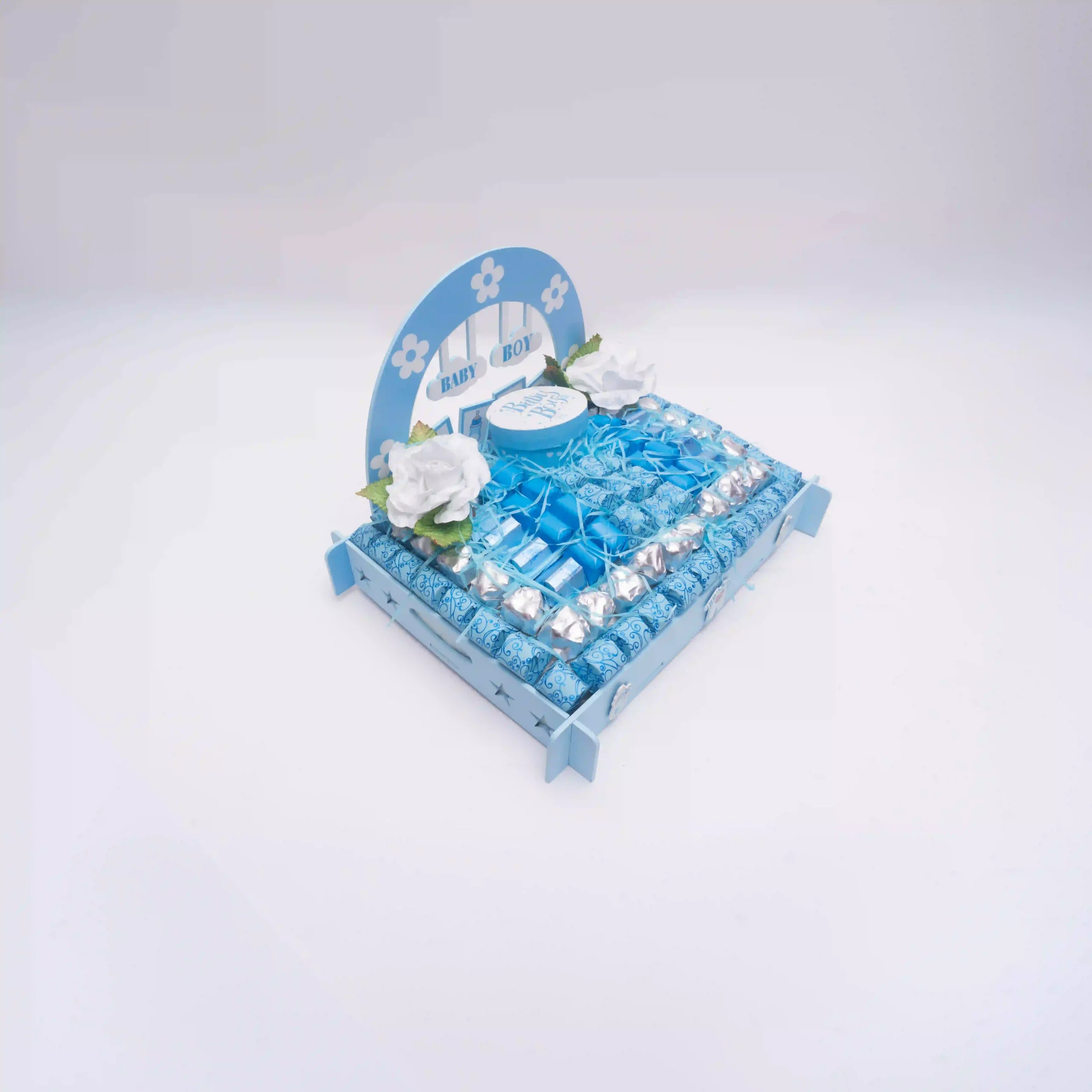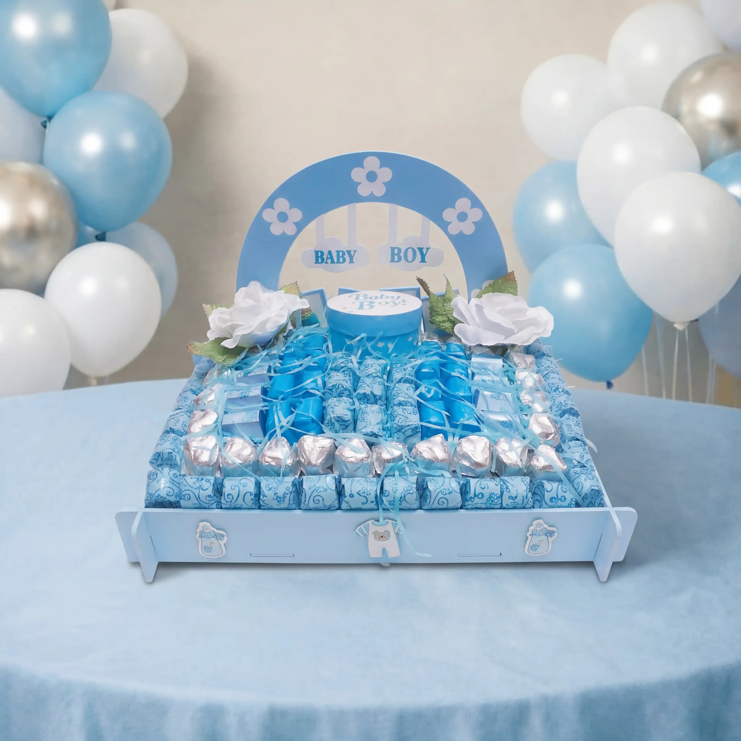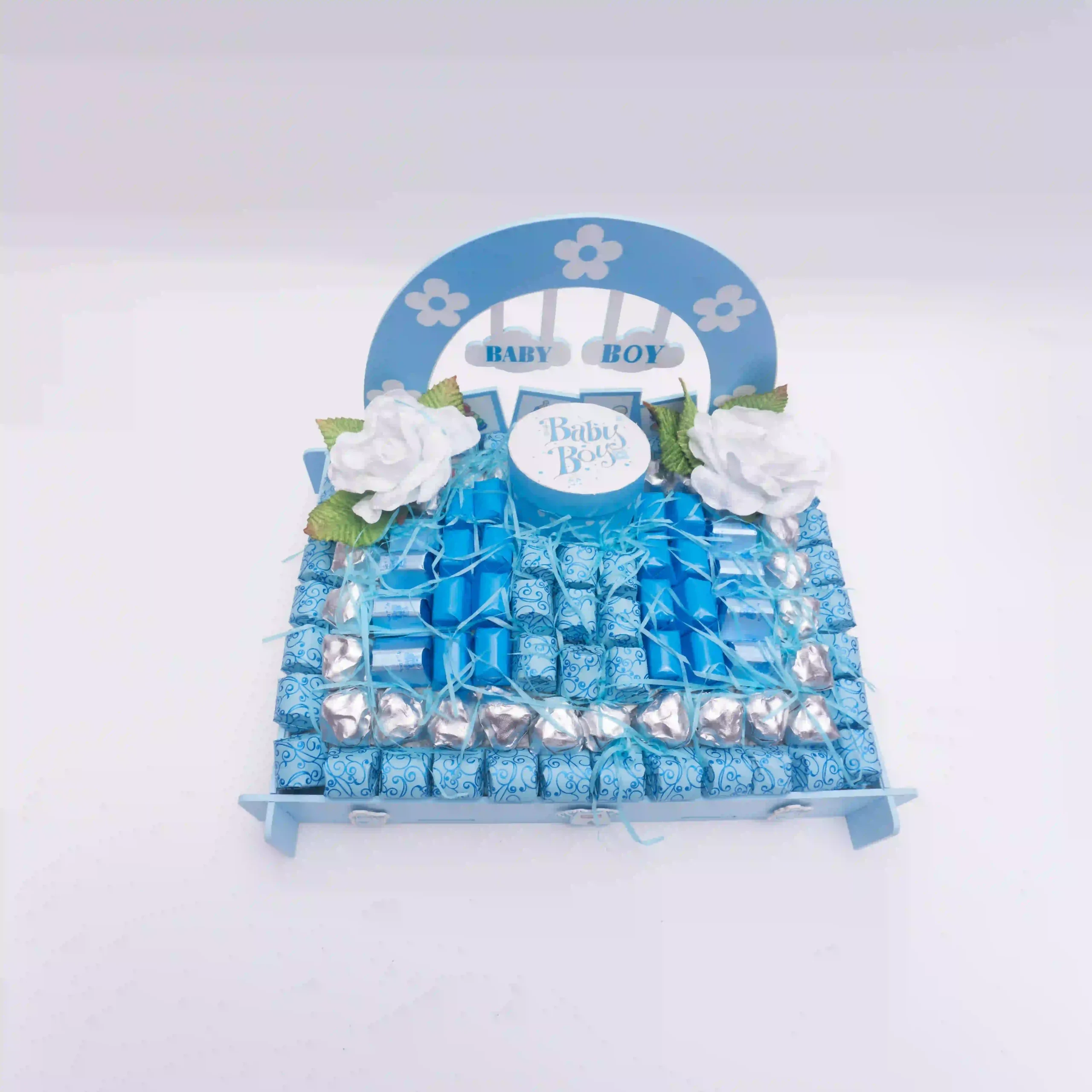 A handsome baby boy basket with 94 chocolates — a lovely gift for a baby shower or a baby boy’s birth.